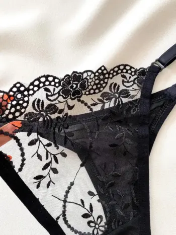 Lingerie set u kombinaciji mrežice i veza s podesivim naramenicama na gornjem dijelu i podesivom širinom u struku. Upute za