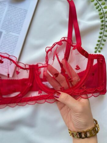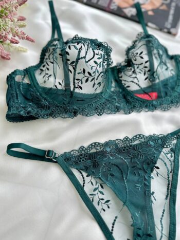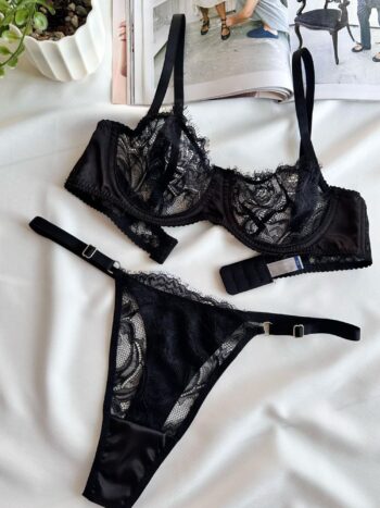 Dvodjelni lingerie set u kombinaciji mrežice i veza s podesivim naramenicama na gornjem dijelu i podesivom širinom u struku. Upute