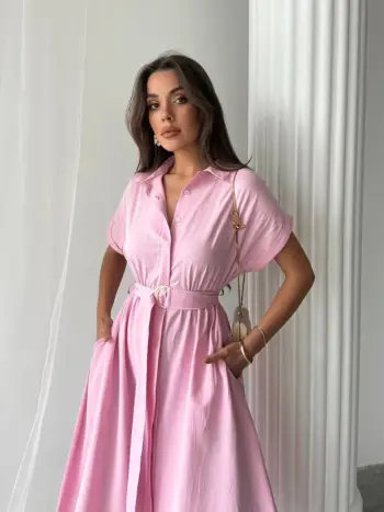 Ova profinjena midi košulja-haljina spaja ženstvenu siluetu i nježne, bogate detalje. Kaskadni volani stvaraju pokret i eleganciju, dok struk naglašava figuru uz pojas na vezanje.