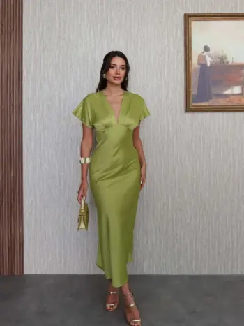 Elegantna maxi haljina izrađena od glatkog satenskog materijala koji pruža sofisticiran i luksuzan izgled. Haljina ima ravni kroj koji ističe