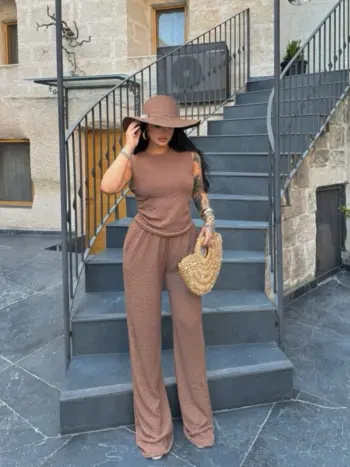 Dvodjelni Set s Otkrivenim Ramenima i Elastičnim Pojasom – Tekstura i Ležerna Prestižnost Ovaj dvodjelni set čine top s otkrivenim