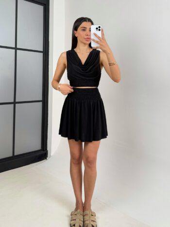 Dvodijelni set koji kombinuje udobnost i ženstvenu siluetu, idealan za tople dane i ležerne, ali stilizovane prilike. Gornji dio krasi