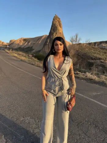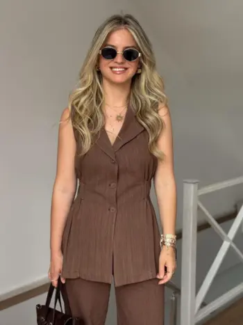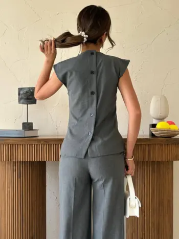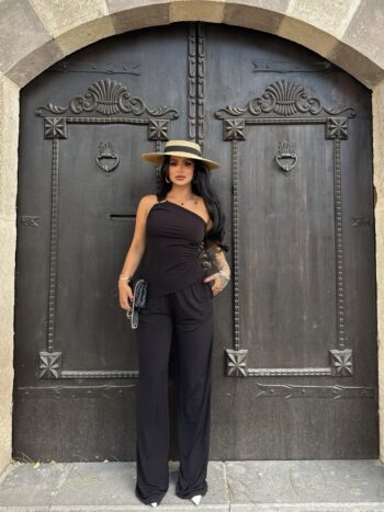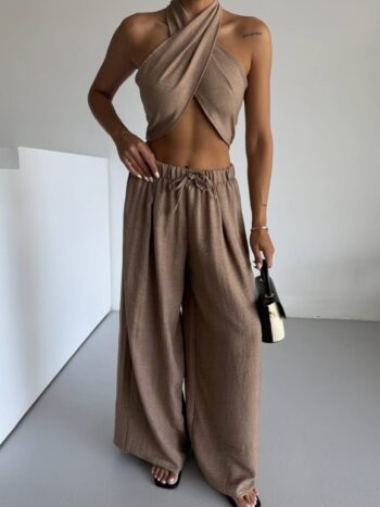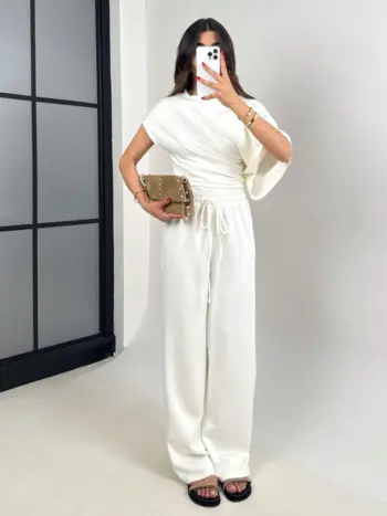 Asimetrični dvodjelni set s elastičnim pojasom Ovaj elegantni dvodjelni set savršen je spoj udobnosti i sofisticirane ležernosti: Gornji dio Asimetrični