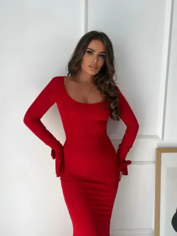 Maxi haljina koja prati liniju tijela, pri dnu se blago širi u zvonasti kroj, stvarajući elegantan i romantičan efekt. Ovratnik