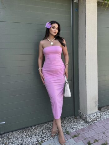 Halter Midi Haljina s Višeslojnom Suknjom Ovaj sofisticirani model ističe profinjenu siluetu kombinirajući duboki halter izrez s bogato nabranim, širokim